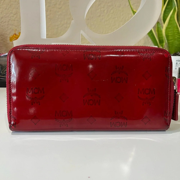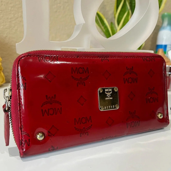 Authentic pre-loved. Red patent leather with the MCM monogram. Gold hardwares. Leather marks and flaws on corners and edges. A linear dent mark as shown in picture due to storage. Faded hardwares.