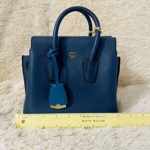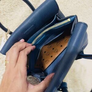 MCM Mini Milla Park Avenue Tote Bag in rich navy leather, accented with elegant gold-tone hardware. This chic mini tote features a structured silhouette, dual top handles, and a luxurious Alcantara-lined interior. Compact yet refined, it’s perfect for carrying your daily essentials in timeless MCM style.