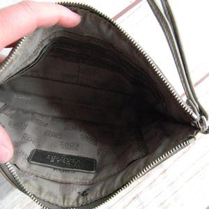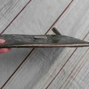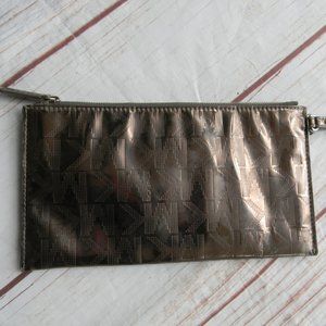 USED CONDITION, MICHAEL KORS MIRROR JET SET LOGO LARGE METALLIC WRISTLET CLUTCH . HAS A BRONZE/DARK GOLD SHINY FINISH. MEASURES 10"LONG BY 6"TALL. PERFECT TO CARRY FOR A HOLIDAY NIGHT OUT! WRISTLET STRAP. INSIDE HAS CREDIT CARD SLOTS. INSIDE COULD USE A GOOD CLEANING, WRISTLET STRAP SHOWS SOME WRINKLING ON THE CENTER OF THE WRISTLET STRAP, NO TEARING. CORNERS AND OUTER METALLIC MATERIAL ARE IN GOOD SHAPE.