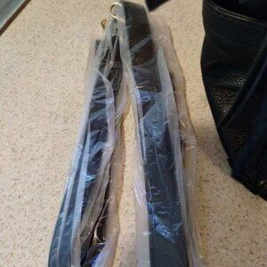 MK Large stunning black leather bag, can be worn with shoulder strap or without. Beautiful brass hardware, lots of room, side pockets one on each side. Inside compartments as well. Brand new tags with price still on it. In perfect condition! Magnetic brass snap closure and decorative hanging tassels.