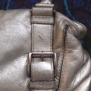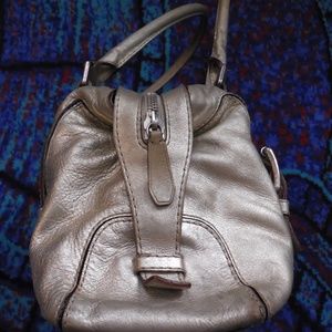 Genuine metallic silver/gold leather. Interior has zip pocket & side accessary pockets.