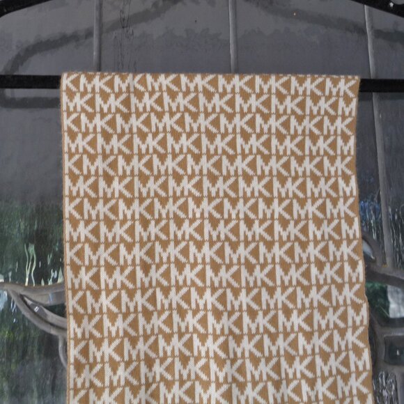 TAN AND WHITE MK LOGO WITH GRAY BAND AT ENDS