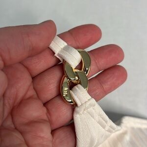 New with tags women’s cream/beige “bone” colored ribbed bikini with gold accents. Panty liner in tact. size medium. Please look at all pics and comment below with any questions