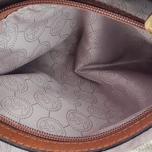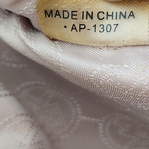 Magnetic closure, triple compartment, 2 slip pickets with accessory pockets plus zip pocket, padded center zip compartment. Key fob intact. Footed bottom.