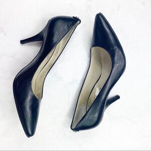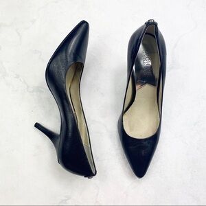 Michael Kors MK Women's Dorothy Flex Leather Pointed Toe High-Heel Pumps. Pointed Toe. Slip On. Classic Leather Black. Color. Silver Logo Button Details. No Stains or Rips. Minor Scuffs. Cute & Comfy. A go-to look with versatile style, these Dorothy pumps from MICHAEL Michael Kors are the perfect pump from work to weekend with a pointed toe and sleek heel. Great for work, business casual, or going out! Heel: 3 1/4'' (Box 5)