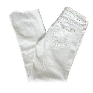 Mother Superior The Dutchie Ankle Jaws jeans in "Almost Innocent" white. Jeans has a chewed hem and back pockets and light factory distressing. They're made of a cotton spandex blend and are a woman's size 25.
