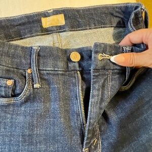 Dark blue jeans with frayed hem. Classic five-pocket style. Button and zip closure.