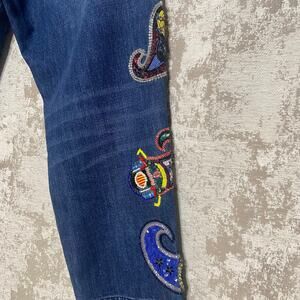 Gorgeous beaded jeans from MSGM! Features high rise waist, zipper fly, full length inseam, classic blue wash denim, small distressed areas on the front of the legs and the back pockets, and multicolored textural beading in paisley patterns on the sides of the legs.