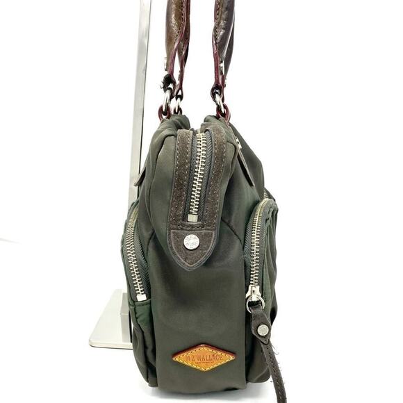 MZ WALLACE SMALL SHOULDER TOTE BAG PUTTY GREEN in good preloved condition. Moderate signs of wear throughout. The leather on the handles is cracked in a few spots but does not affect the use or carrying ability, not very visible either. Clean. No stains or marks. Please check the photos in the listing carefully prior to purchasing. Measurements are in the photos.
