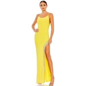 Mac Duggal 42002 Yellow Scoop Neck Beaded Slit Prom Dress Size 4