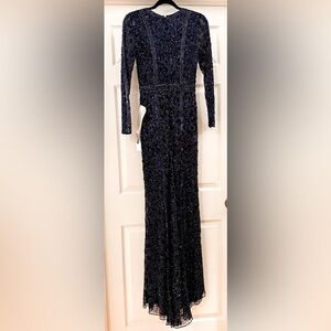 New with tags. Mac Duggal Embellished Front Slit Long Sleeve Gown Midnight Blue. Size 4.