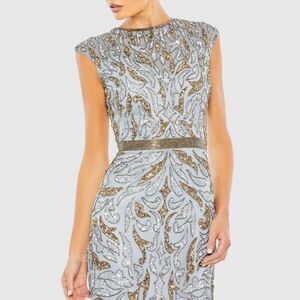 Mac Duggal 5532 Size 14 Blue Gold Beaded Sequined Column Gown Long Maxi Dress