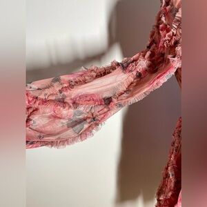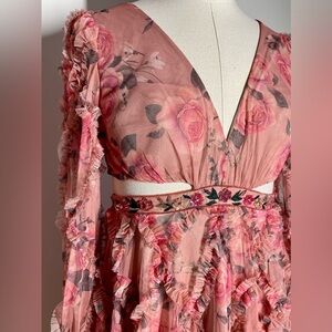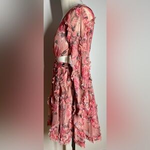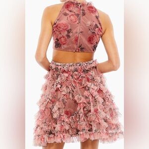 From the Mac Collection. Mac Duggal's sleeveless minidress is crafted of chiffon. This floral style features a round neck, a cut-out waist, and a flared skirt trimmed with ruffles. Women’s size 10, shades of pink and dark pink.