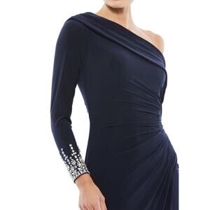 One shoulder / Off-the-shoulder long sleeve jersey gown accented with jeweled cuffs and a thigh-high slit.