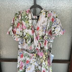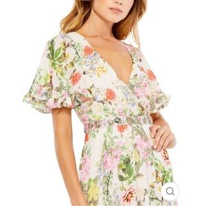 Mac Duggal FLORAL PRINT FAUX WRAP FLUTTER SLEEVE A LINE GOWN size 12 $498