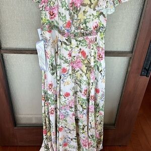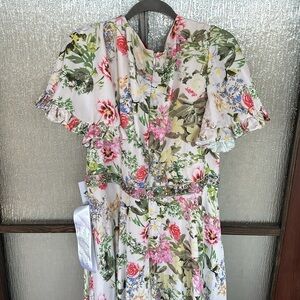 Floral surplice maxi dress with a faux-wrap v-neckline, ruffle-trimmed short bell sleeves, and a pleated full-length skirt. The waist is accented with a floral rhinestone-embellished belt.