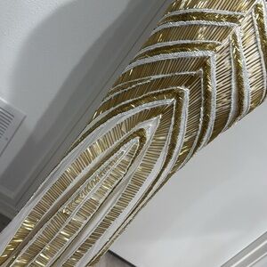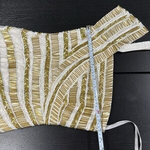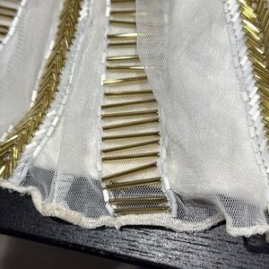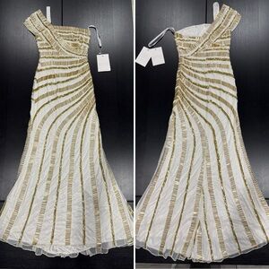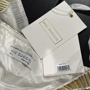 Mac Duggal Gold Beaded White One Shoulder Sample Gown in Size 2. Absolutely stunning, classic, timeless design. White gown adorned with gold beads. One shoulder accent. Exudes elegance and class. New with tags. Minor signs of handling, overall great condition. The bottom seam is slightly dusty from hanging on the sample rack. There are a few missing beads (maybe only three of the thousands on the gown), which is normal for a beaded gown, and not noticeable at all. Not a production gown (…yet) so the style number on the tag does not coordinate when looked up.