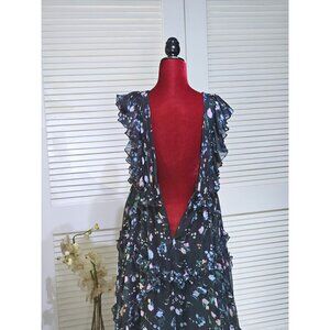 This captivating bohemian-style maxi dress features a delicate floral pattern on a black chiffon fabric. The ruffled sleeves and V-neck design add an element of romantic charm, making it a stylish choice for daytime outings or evening gatherings. Its flowing fit and maxi length offer both comfort and elegance, providing a graceful silhouette that complements a variety of body shapes.