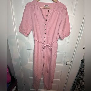 Madewell Linen Blend Puff Sleeve Tassle Tie Jumpsuit in PINK Size M