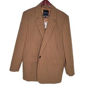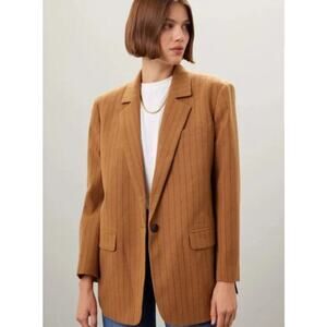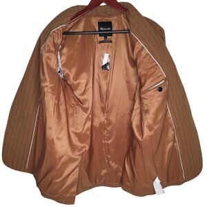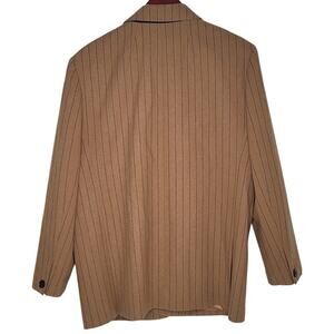 Brown stripe knit (52% Wool, 17% Viscose, 1% Elastane, 30% Recycled Polyester). Blazer. Long sleeves. Collar. Front button closure. 31" from shoulder to hemline. Imported.