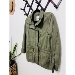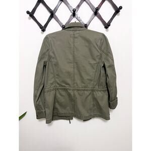 This chic utility jacket offers style and function, and is in perfect condition. Sized small but the relaxed fit makes it perfect for Small to Medium frames. Features zipper and snap closures, multiple interior and exterior pockets, and an interior drawstring to cinch the waist.