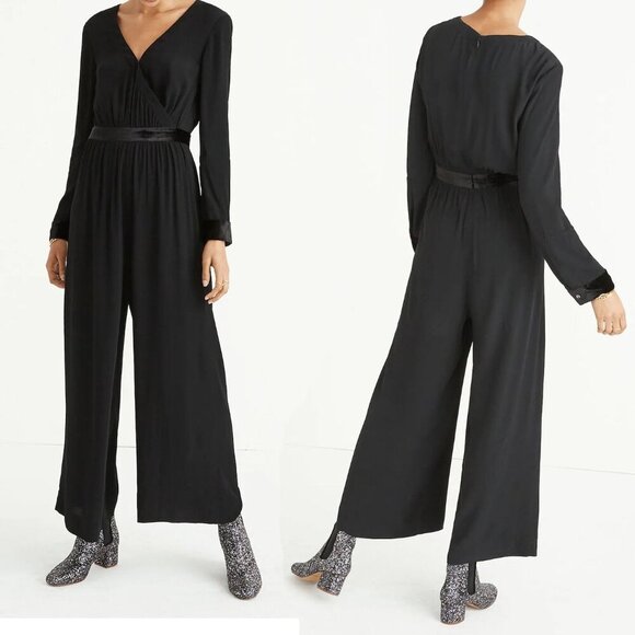 This elegant Madewell jumpsuit features a drapey wrap design with a velvet trim, ensuring a relaxed yet chic look. Its wide-leg silhouette offers comfort and style, perfect for various occasions.