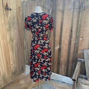 Flattering and feminine with a faux-wrap front, this floral midi dress has pretty ties on the sleeves (cinch them for a peekaboo effect).