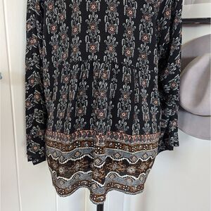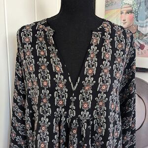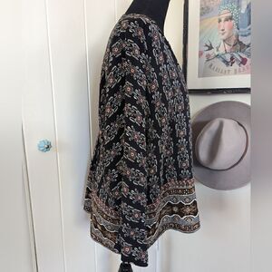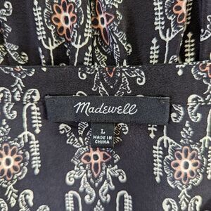 Description: Madewell Black Silk Boheme Popover Shirt Burnished Floral Top L l Bohemian Western Ranch Prairiecore Preppy Whimsigoth ,100% silk, split v-neck, flowy fit, peasant style, detailed border print,