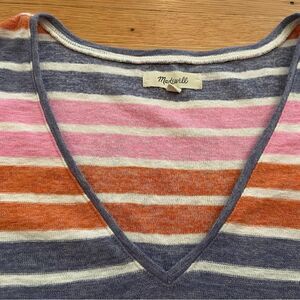 Madewell Skyline V-neck Tee in Elliott Stripe. Short sleeve. Lightweight sweater material. Orange/pink/blue/white horizontal stripes. 62% cotton, 38% polyester. Armpit to armpit 20 inches. Length 22 inches. Size small. Good condition.