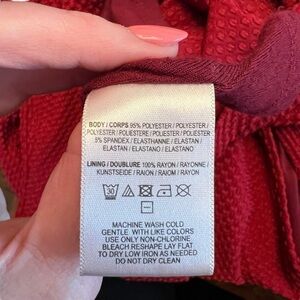 Textured Swiss dot pattern, asymmetrical hem, deep cranberry red