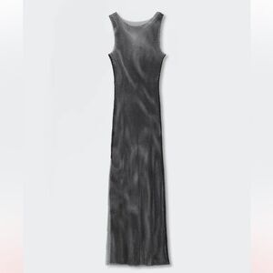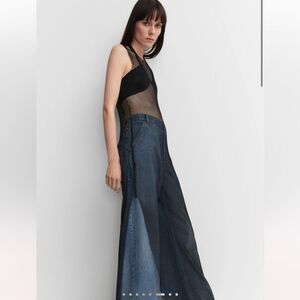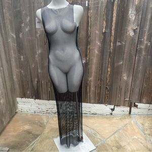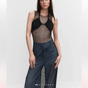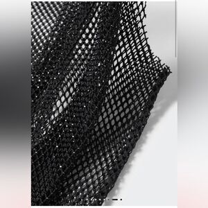 Mesh fabric. Long design. Straight design. Decorative crystals details. Rounded neck. Sleeveless. Unclosed.