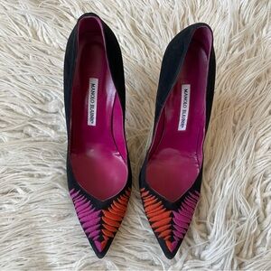 Manolo Blahnik Black Suede Multicolor Embroidered Accent Pointed Toe Pump EUC 41