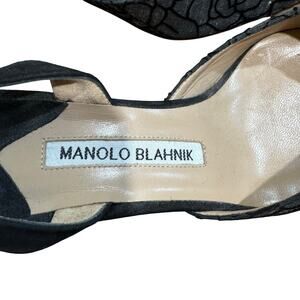 Manolo Blahnik Black Velvet Floral Slingback Heels Textured Fabric Pumps EU 37.5