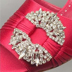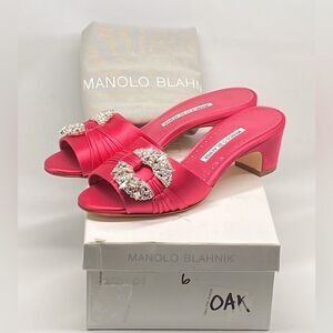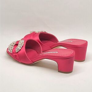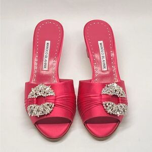 Manolo Blahnik's Prinap sandals feature a satin upper and are set on a smooth leather sole. Made in Italy, this pair is decorated with a classic crystal brooch.