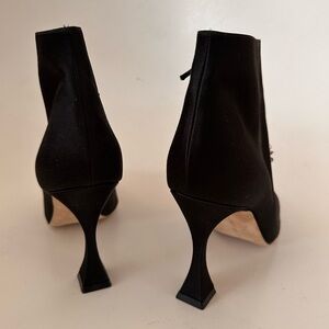 The Cantita booties from Manolo Blahnik are crafted of lustrous satin with a crystal-embellished buckle at the vamp.
