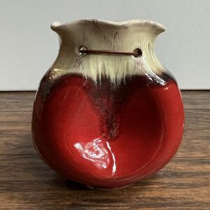 Vintage handmade pottery vase by Spanish artist, Manuel Garcia. This ARROYO red sack vase features beige and red glaze, six holes around the top laced with a brown leather string to create the sack style of the vase. This handmade collectible pottery piece is a beautiful addition to any collection. Crafted by the well known and respected potters of the Manuel Garcia Arroyo Pottery in the mid-century modern style, this vase is a true work of art.