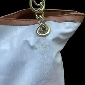 Marc Fisher white red and orange tote bag purse with faux leather outer, logo fabric lining, gold colored hardware, top snap closure, interior zip pocket, two interior slide media pockets, double shoulder straps and chain link detail.