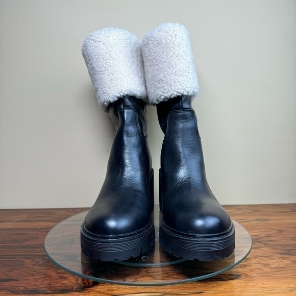 A plush cuff of genuine shearling warms a gorgeous, winter-ready leather boot lofted by a block heel and finished with a lugged, traction-enhancing sole.