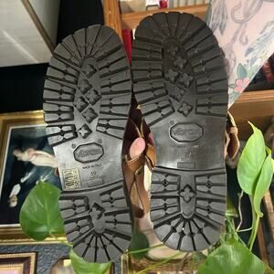Adjustable brass buckle fastening. Sling back, ankle strap. Leather insole. Treaded, authentic, Vibram rubber sole.