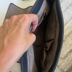 Gently pre-loved. There is visible discoloration and wear on the cream leather, especially along the bottom corners and flap (see close-up photos). Some scuffing on the strap and minor darkening on hardware. The interior is clean and functional, and the overall structure is still solid.
