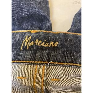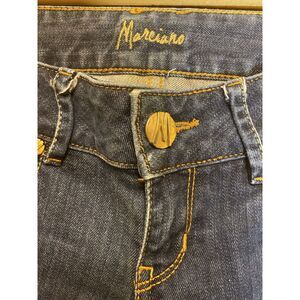 Pre-owned in excellent use condition. Mariano Women's Denim Strait Skinny Jeans in size 26 are a comfortable and lightweight pair of jeans that come in a solid blue color. The jeans feature a 5-pocket design with a low rise and a skinny fit. They have a zip and button closure and are made of machine washable denim fabric. The accents include a button, zipper, and logo. The jeans have an inseam of 29 inches and are suitable for all seasons.