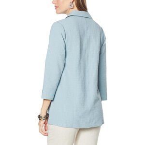 Vertical running stitches and buttoned, on-seam side slits give this classic, Henley popover figure-flattering style.