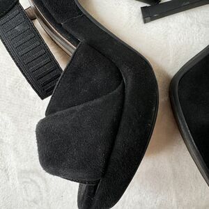 Awesome Marni made in Italy stiletto platforms, very architectural goth, could take them in a few directions stylistically. Suede black upper with matte resin heel and elastic ankle strap.