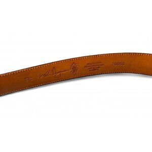 This Martin Dingman black milled finished leather belt is a stylish and timeless accessory for men. Handmade in the United States, this size 100/40 belt features a solid brass buckle and a sleek design perfect for a classic and minimal luxury neutral look. The black leather material and silver tone hardware add a touch of sophistication to any outfit, making it a versatile and essential piece for any wardrobe.