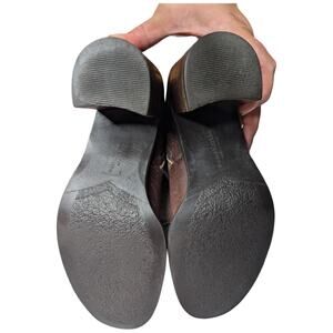 Brown leather and beige suede knee high boots with an almond shaped toe, 3.5" stacked wooden block heel, inner zip entry, faux shearling lining, and strap accents, from Matisse. Good condition with minimal wear on the soles and some minor heel drag, see photos for detail. Shaft height measures 12" from back of heel, calf measures 6.5" laid flat.
