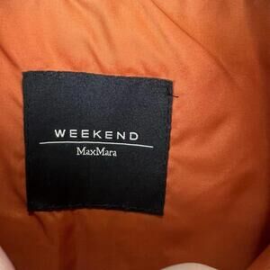 This is a Weekend Max Mara vest in deep orange corduroy, featuring a quilted style and lined interior. It is designed for women, size 4, with the iconic Max character. The outer shell material is polyester, and the fabric type is corduroy.
