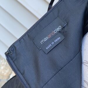 Beautiful textured Max and Cleo black cocktail dress. Made of 100% polyester and fully lined with 100% acetate. Bust is padded and straps are adjustable. Hidden back zip, does zip all the way just doesn’t fit the mannequin. On seam hand pockets.
