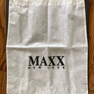 Interior is divided into two sections by a full zip pocket with 2 slip pockets on the front wall and one slip- pocket and a zip pocket on the back wall with "Maxx New York" on it
