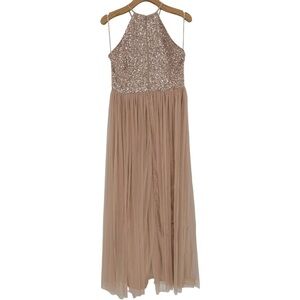 Maya Deluxe Fairy Tulle Sequin Embellished Halter Neck Maxi Dress Taupe Blush 8