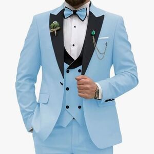 New no tag only missing the top button on the vest see last picture , before purchase please , otherwise it’s new great condition, Elegant light blue suit with black lapel. Includes matching vest and bow tie. Perfect for formal occasions.